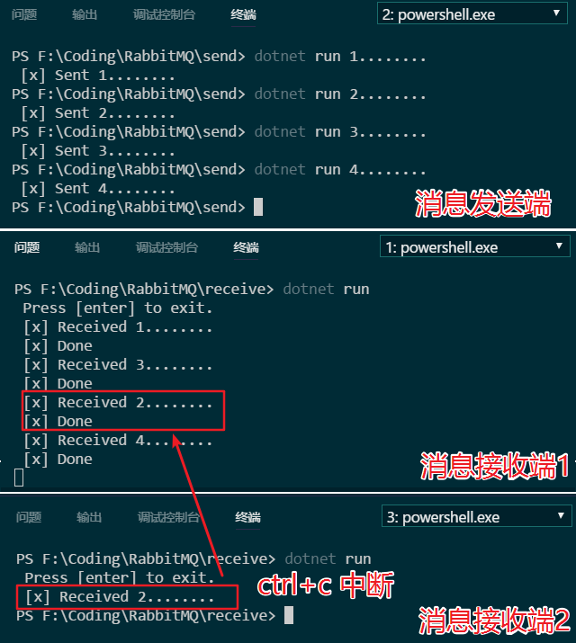 在消费端2未处理完第一条消息之前,手动中断(ctrl+c)。我们可以发现RabbitMQ在下一次分发时,会优先将被中断的消息分发给消费端1处理。
