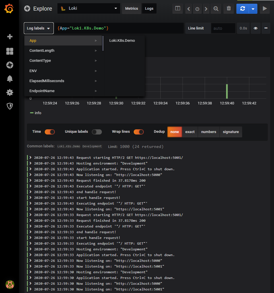 PS C:\Users\Shengjie> helm list NAME NAMESPACE REVISION UPDATED STATUS CHART APP VERSION loki-stack default 1 2020-07-26 11:58:11.022896 +0800 CST deployed loki-stack-0.38.3 v1.5.0 PS C:\Users\Shengjie> kubectl get pod -w NAME READY STATUS RESTARTS AGE loki-stack-0 1/1 Running 0 2m33s loki-stack-grafana-c447cfbd-z6tbg 1/1 Running 0 2m33s loki-stack-promtail-j47hl 1/1 Running 0 2m33s PS C:\Users\Shengjie> kubectl get svc -w NAME TYPE CLUSTER-IP EXTERNAL-IP PORT(S) AGE kubernetes ClusterIP 10.96.0.1 <none> 443/TCP 56d loki-stack ClusterIP 10.110.83.209 <none> 3100/TCP 2m52s loki-stack-grafana ClusterIP 10.111.24.26 <none> 80/TCP 2m52s loki-stack-headless ClusterIP None <none> 3100/TCP 2m52s